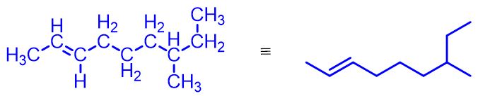 We can immediately see that one linear chain contains 8 carbon atoms, while the other contains 9. Both chains include the double bond, so the fundamental requirement—that the parent chain must necessarily contain the double bond—is satisfied in both cases.