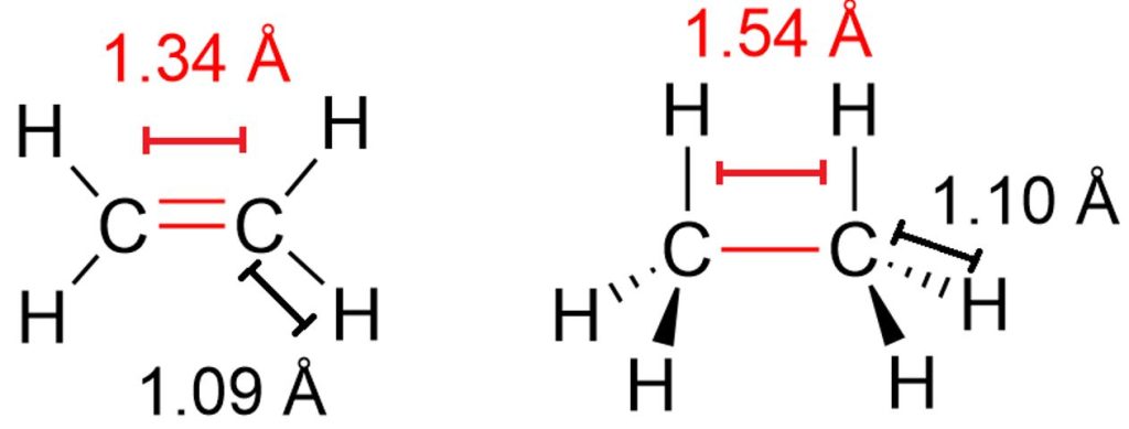 If we take the ethylene molecule as an example again, we see that the C=C bond length is 1.34 Å (Figure 7), whereas the C–C bond length in the corresponding alkane (ethane) is 1.54 Å. However, if we also compare the C–H bond lengths in ethylene and ethane, we notice that these bonds are also shorter in ethylene (1.09 Å vs 1.10 Å).
