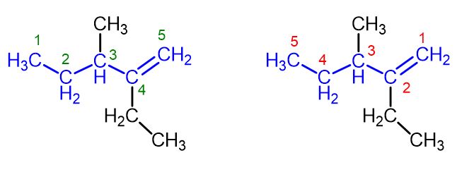 The chain numbered from left to right (green numbers) places the first carbon atom of the double bond at position 4. In contrast, the chain numbered from right to left (red numbers) places the first carbon atom of the double bond at position 1.