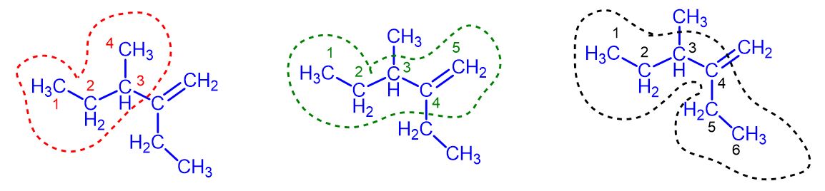 In the third case (black numbers), the chain is longer, with 6 carbon atoms, but it does not contain the double bond.