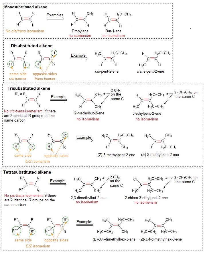 Tri- and tetrasubstituted alkenes exhibit cis–trans isomerism in almost all cases, except when there are two identical substituents on the same carbon atom involved in the double bond.