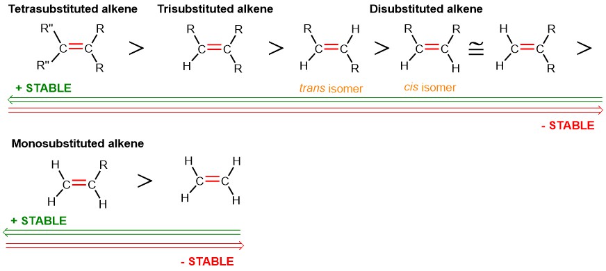 Therefore, in general, we can derive the following rule: the more substituted alkene is more stable than a less substituted one, and the trans alkene is more stable than the cis alkene.