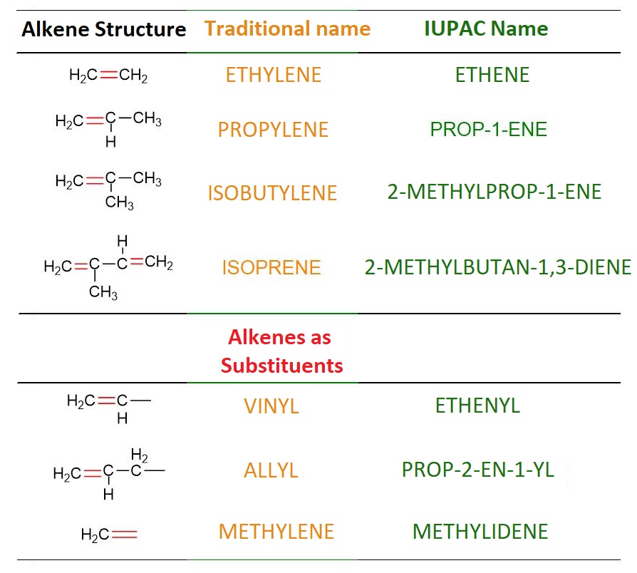 Table 2. Traditional nomenclature vs IUPAC nomenclature of most common alkenes