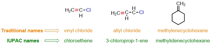 In the last three rows of Table 2, some examples of traditional names for substituent alkenes are reported. These names can be used to designate certain olefins, as shown in the figure below.