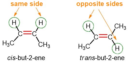 Let us consider the first alkene that exhibits this type of isomerism, namely but-2-ene. From the image below, it can be seen that in the cis isomer of but-2-ene the two hydrogen atoms are on the same side, and the same is true for the two CH₃ groups. In the trans isomer, on the other hand, the two hydrogen atoms are on opposite sides, as are the two CH₃ groups.