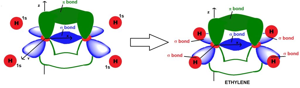 However, both carbon atoms also possess an unhybridized pz orbital. The unhybridized pz orbitals interact laterally with each other, creating a π-type bonding molecular orbital, with electron density located above and below the xy plane.