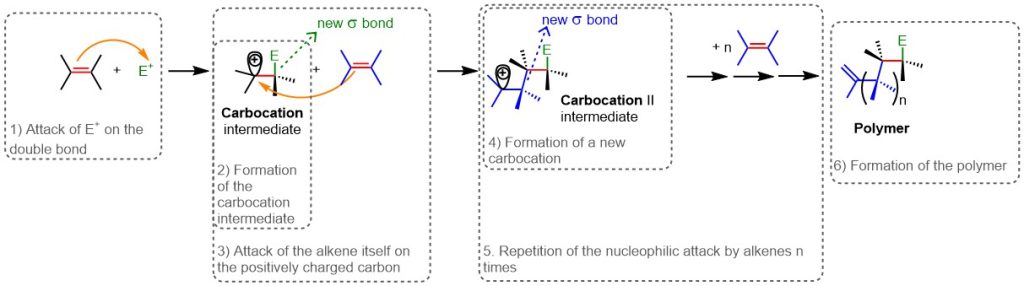 In more detail, after the attack of an electrophile on the double bond (Step 1, Figure 15) and the formation of the carbocation (Step 2, Figure 15), in polymerization another alkene molecule reacts with the carbocation (Step 3, Figure 15). This generates a new carbocation (Step 4, Figure 15), which can in turn react with another alkene molecule, and so on (Step 5, Figure 15). The process repeats many times, producing a polymer (Step 6, Figure 15)—a high-molecular-weight molecule in which molecular units repeat regularly along the length of the polymer chain.