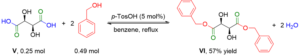 In a round-bottom flask equipped with a Dean-Stark trap with a condenser, connected to a nitrogen cylinder, and a magnetic stirrer, d-tartaric acid V 37.75 g (0.25 mol), benzyl alcohol 53.0 g (195 mol%), para-toluenesulfonic acid monohydrate 2.37 g (5 mol%), and 110 ml of benzene are added. The reaction mixture is refluxed until complete water evolution (20 h) and then brought back to room temperature. Isooctane (100 ml) is added, and the formed precipitate is filtered and redissolved in 300 ml of EtOAc. The organic phase is washed with a saturated aqueous solution of NaHCO3 (2 x 75 ml) and a saturated solution of NaCl (2 x 50 ml), dried over Na2SO4, and filtered. The solvent is removed using a Rotavapor. The crude product is dissolved in toluene (200 ml), and the product is precipitated by adding 200 ml of isooctane. After filtration and drying under high vacuum, compound VI, 46.02 g (57% yield), is obtained as a white solid.[3]