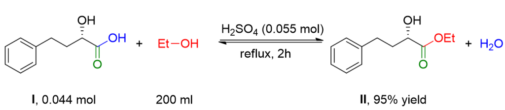 To a solution of hydroxy acid I (8.0 g, 0.044 mol) in anhydrous ethanol (200 ml), concentrated H2SO4 (3 ml) is added. The mixture is refluxed for 2 hours. The solvent is removed under reduced pressure to eliminate excess ethanol, and a mixture of H2O (50 ml) and ethyl acetate (200 ml) is added. The organic phase is washed with an aqueous solution of NaHCO3 and with a saturated solution of NaCl. Finally, it is dried over Na2SO4 and filtered. The solvent is removed using a Rotavapor to obtain ester II as a pale yellow oil (8.9 g, 95% yield).[1]