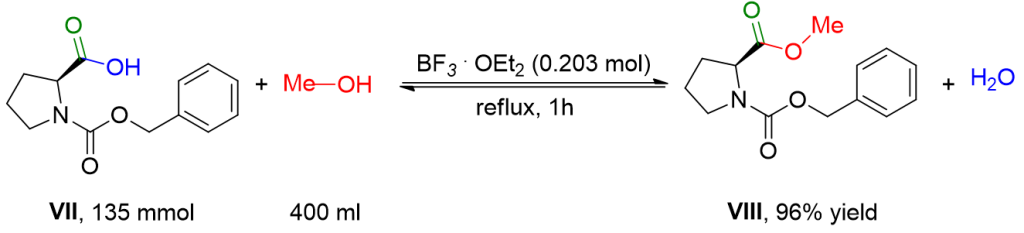 A round-bottom flask, equipped with a condenser and a magnetic stirrer, is charged with 33.7 g (0.135 mol) of N-(benzyloxycarbonyl)-(S)-proline VII and 400 mL of anhydrous methanol under an inert atmosphere. Boron trifluoride (24.6 mL, 28.4 g, 0.2 mol) is added to the mixture with stirring. The resulting solution is then refluxed for 1 hour. The solvent is removed under reduced pressure, and the residue is vigorously shaken with 200 ml of ice-cold water and extracted with EtOAc (3 x 100 mL). The extracts are combined and successively washed with a saturated solution of NaCl, a 1 M aqueous solution of NaHCO3, and a saturated solution of NaCl. The organic phase is dried over Na2SO4 and filtered. After removing the solvent under reduced pressure, the resulting colorless oil is dried by dissolving twice in 100 ml of anhydrous toluene and subsequent removal of the solvent under reduced pressure. Compound VIII is obtained as a colorless oil (34.2 g, 96% yield).[4]