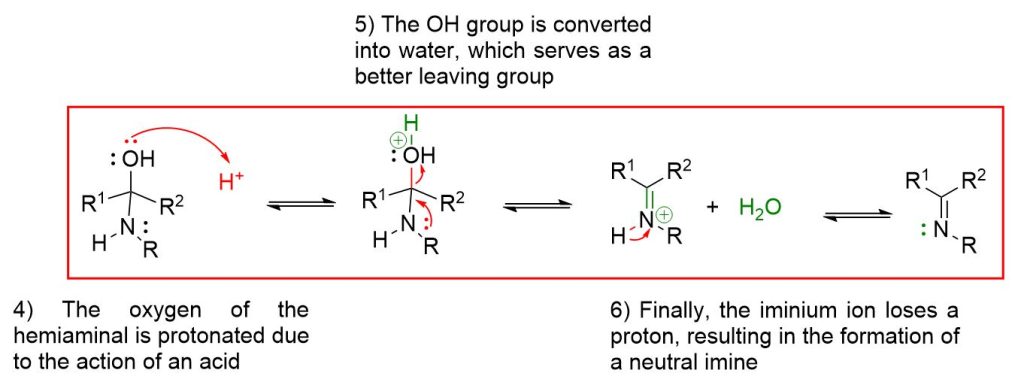 In the second step, however, an acid is introduced to facilitate the elimination of the OH group, as water, and lead to the formation of the imine. Furthermore, since all the described steps are equilibrium processes, it is necessary to shift the reaction to the right for complete conversion.