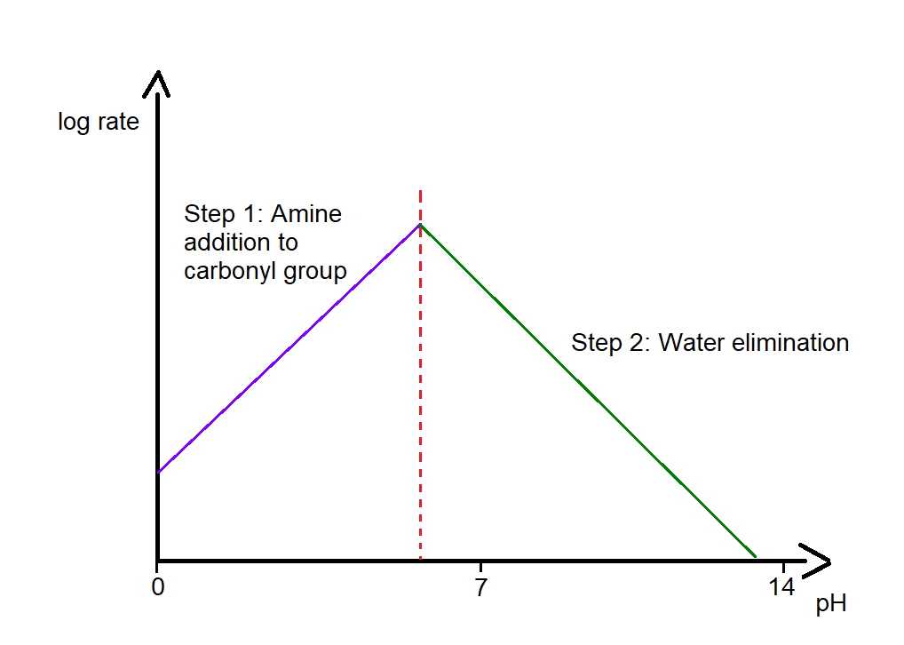 Specifically, it has been observed that the reaction proceeds faster when the pH is in the range of 4-6. At more acidic pH values, below 4, the reaction slows down because, at such pH levels, the primary amine is fully protonated, which decreases the rate of the first reaction stage (see figures below). At higher pH values, above 6, the concentration of H⁺ ions is too low to favor the protonation of the OH group, thereby slowing down the second stage of the reaction.