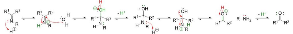 As we have repeated several times in this article, the imine formation reaction is reversible. This means that once imines are formed, if they encounter water, they can easily hydrolyze and revert to a primary amine and a carbonyl compound. This hydrolysis often occurs even without basic or acidic catalysis. The hydrolysis reaction is the reverse of imine formation and is shown below.