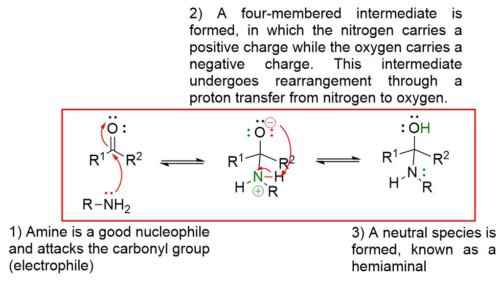 As can be seen from the mechanism described above, the first step involves the nucleophilic attack of the primary amine on the carbonyl to form a neutral four-center intermediate called a hemiaminal.