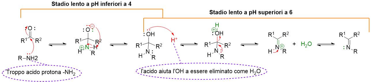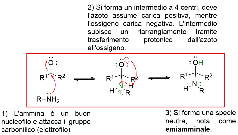 Come si può vedere dal meccanismo sopra descritto, il primo step coinvolge l’attacco nucleofilo dell’ammina primaria al carbonile per formare un intermedio neutro a 4 centri detto emiamminale.