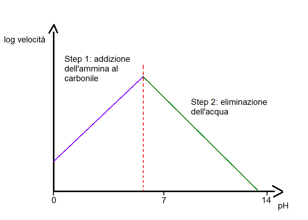 In particolare è stato visto che la reazione avviene più velocemente se il pH è nell’intervallo 4-6. A pH più acidi, inferiori a 4, la reazione rallenta, questo perchè a tali pH l’ammina primaria è tutta protonata e quindi la velocità del primo stadio di reazione rallenta (scorri le figure in basso). A pH più alti, sopra 6, la concentrazione di ioni H+ è troppo bassa per favorire la protonazione dell’OH e, quindi, il secondo stadio di reazione risulta rallentato.