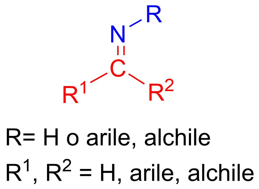 Come si vede dalla figura un’immina è caratterizzata da un doppio legame tra il carbonio e l’azoto, C=NH, o, nella maggior parte dei casi, C=NR , dove R può essere qualsiasi gruppo alchilico o aromatico.