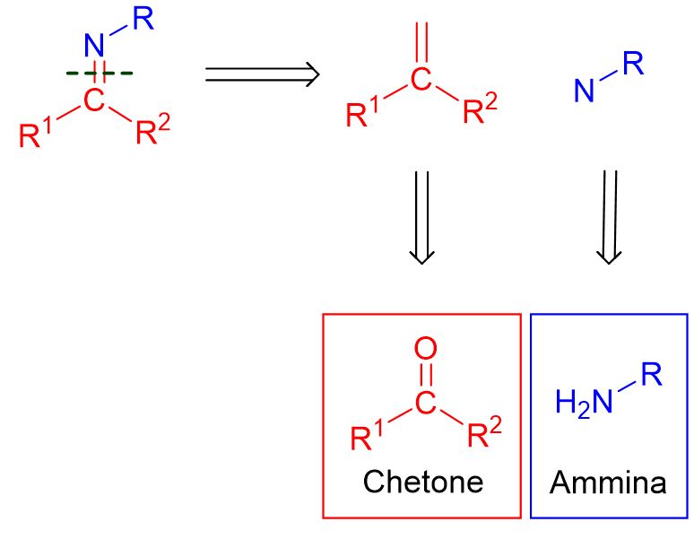 Abbiamo detto che le immine sono caratterizzate da un doppio legame tra C e N, C=N. Se noi rompiamo tale legame otteniamo i pezzi da cui l’immina è formata (vedi figura in basso). Il primo pezzo, in rosso, è un carbonio con un doppio legame. Ora la possibilità più semplice è che tale carbonio si leghi a un ossigeno. In questo modo abbiamo ricostruito la prima classe di composti necessaria per formare un immina, ossia le aldeidi e i chetoni. La seconda classe la possiamo derivare dal pezzo in blu (immagine in basso). Tale pezzo è un N-R e, se completiamo la valenza dell’azoto con dei semplici idrogeni, otteniamo un’ammina primaria.