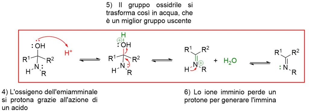 Nel secondo step, tuttavia interviene un acido per favorire l’eliminazione del gruppo OH, come acqua, e portare alla formazione dell’immina. Inoltre, siccome tutti gli step descritti sono di equilibrio, occorre spostare la reazione a destra per una conversione completa.
