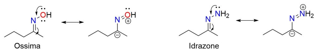 In generale possiamo dire che le immine più stabili sono quelle dove o l’atomo di C o quello di N recano un gruppo aromatico. Questo tipo di immine sono abbastanza stabili da poter essere isolate. Invece le immine derivanti dall’ammoniaca non possono essere isolate, perchè molto instabili; tuttavia sono rivelabili in soluzione. Infine, immine molto stabili sono quelle in cui l’atomo di N reca un gruppo elettronegativo: è il caso delle ossime, idrazoni e semicarbazoni, che puoi vedere nella figura in basso.