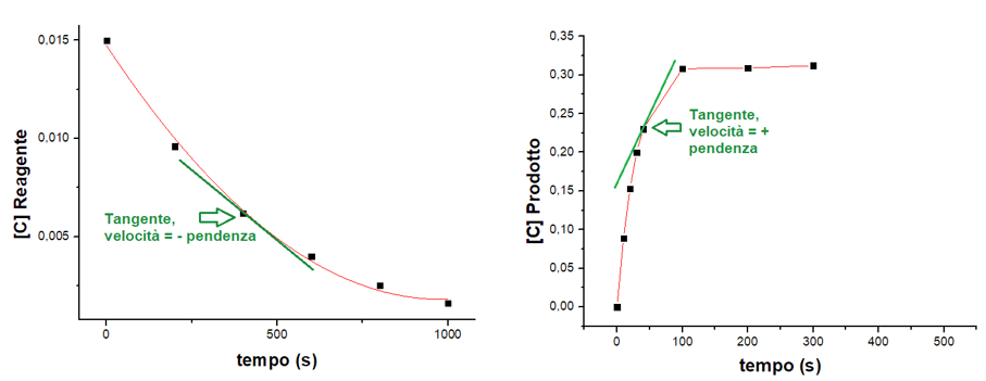 Nel grafico a sinistra, si vede come la concentrazione dei reagenti diminuisce dapprima velocemente e poi sempre più lentamente. Similmente la concentrazione dei prodotti, grafico a destra, aumenta all’inizio velocemente e poi sempre più lentamente.