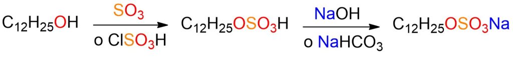 Dal punto di vista industriale, l’SDS viene prodotto attraverso la solfonazione dell’alcol laurico, che viene fatto reagire con triossido di zolfo (SO₃) o acido clorosolfonico (ClSO₃H). Questa prima reazione è seguita da un trattamento con idrossido di sodio (NaOH) o bicarbonato di sodio (NaHCO₃) (vedi figura in basso) [1].