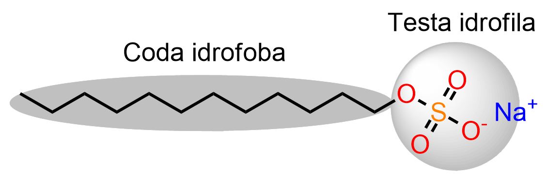 Per chi ha un leggero occhio chimico, dalla formula di struttura si può notare che la molecola ha una doppia natura: una testa idrofila (attratta da molecole polari come l’acqua) e una coda idrofoba (attratta da sostanze non polari come olio e grasso) [1].