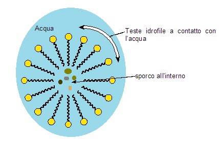 A una certa concentrazione, le molecole di SDS si aggregano formando delle sfere che intrappolano lo sporco al loro interno (vedi figura in basso). Queste sfere sono chiamate micelle e costituiscono il principio di funzionamento di tutti i detergenti. Le micelle, racchiudendo lo sporco al loro interno, lo rimuovono dalla superficie lavata grazie all’acqua. In altre parole, l’SDS agisce rendendo lo sporco solubile in acqua e quindi facilmente eliminabile.