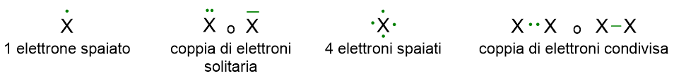 Si usano punti per indicare gli elettroni di valenza degli atomi (vedi Figura 1). Due punti (o in alternativa un trattino) possono indicare una coppia solitaria o se condivisi tra due atomi indicano una coppia di legame. Un elettrone isolato indica un elettrone spaiato.