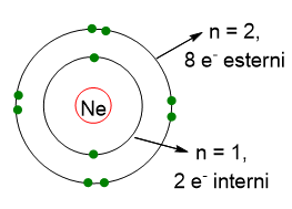 Questo numero di elettroni dà stabilità all’atomo ed equivale al numero di elettroni di valenza posseduti dai gas nobili (Gruppo 18 della Tavola Periodica degli elementi). Tali elementi infatti tendono generalmente a non reagire e a restare atomi singoli. Nella Figura 4 si vede l’atomo di neon con i suoi elettroni di valenza pari a 8. In particolare l’atomo di neon ha 8 elettroni nel livello energetico n=2, mentre ha 2 elettroni nel livello n=1. Questi ultimi 2 elettroni sono nel guscio interno dell’atomo, quindi non vengono considerati nel modello di Lewis.