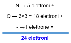 Esempio) prendiamo lo ione NO3– e contiamo gli elettroni di valenza. L’N ha 5 elettroni di valenza, l’O ne ha 6, ma, siccome ci sono 3 atomi nella molecola, in tutto l’ossigeno contribuisce con 6×3= 18 elettroni. Inoltre c’è una carica negativa. Quindi se sommiamo tutto abbiamo 24 elettroni.