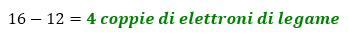 - Calcolare le coppie di elettroni impegnate nei legami. A tal fine, si calcola la somma degli elettroni totali che ogni atomo deve avere intorno per essere stabile seguendo la regola dell’ottetto. Quindi 8 elettroni per tutti gli elementi principali, escluso H e He a cui invece bastano 2 elettroni. Inoltre, occorre considerare che elementi come S o P potrebbero espandere l’ottetto fino a 10, 12 elettroni. In ultima analisi, considerare che B e Al potrebbero avere ottetto incompleto, quindi potrebbero essere sufficienti solo 6 elettroni per essere stabili. Tale somma degli ottetti, duetti, ottetti espansi o incompleti va sottratta alla somma degli elettroni di valenza calcolati al punto [1]. La differenza va divisa per due per ottenere le coppie di elettroni di legame.