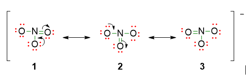 Tornando proprio all’esempio della molecola di NO3–, è possibile spostare il doppio legame coinvolgendo un atomo di ossigeno differente. Si ottengono in questo modo altre 2 strutture, la 2 e la 3, esattamente equivalenti a quella originaria, 1.