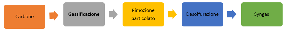 La gassificazione ĆØ operata con materiale di partenza come carbone. Dopo la gassificazione di deve rimuovere il particolato prima di poter isolare il syngas. Ecco uno schema dei processi coinvolti: