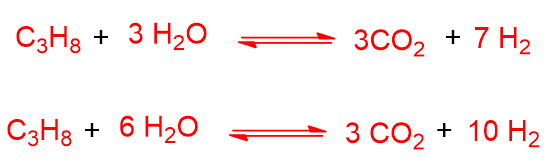 Invece del metano, nello steam reforming si possono usare anche propano o nafta. Come si può vedere in basso, il propano dà la reazione di steam reforming con rapporti più alti di CO/H2 rispetto al metano, specialmente se si aumenta la quantità di vapore (seconda reazione in basso):