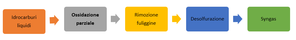 Il syngas può essere prodotto anche attraverso ossidazione parziale a partire da vari substrati come carbone, metano, nafta. Tale metodo ĆØ scelto per materie prime di partenza che sono idrocarburi liquidi. Dopo aver operato lāossidazione parziale si deve rimuovere la fuliggine (SOOT) e poi di deve desolforare prima di poter avere il syngas. Si veda lo schema sottostante, che riassume le varie fasi del processo.