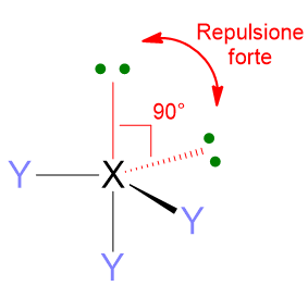 Un altro aspetto importante di queste repulsioni è che esse dipendono dalla distanza angolare a cui si trovano le coppie di elettroni. 2 coppie di elettroni che si trovano a 90° l’una dall’altra si respingeranno molto di più che due coppie a 120° o ancora di più di quelle a 180°. Dunque le repulsioni a 90° sono quelle più importanti per definire la geometria molecolare.