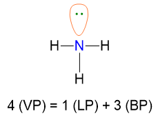 Facciamo un primo esempio per capire i punti 1-5. La molecola di NH3 ha la seguente struttura di Lewis (punto 1), da cui possiamo calcolare VP, BP e LP (punto 2).