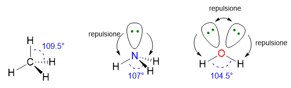 Dei tipici esempi sono le molecole di CH4, NH3 e H2O. Tutte e tre le molecole hanno VP = 4, quindi hanno la stessa disposizione spaziale degli elettroni che è tetraedrica. Tuttavia solo CH4 (LP = 0) possiede i perfetti angoli di 109.5° del tetraedro, mentre NH3 e H2O hanno angoli di 107° e 105° rispettivamente (Figura 6). Gli angoli dell’acqua sono anche più ridotti perché ci sono 2 LP nella molecola che esercitando una repulsione maggiore sia tra di loro sia verso i BP, restringono ancora di più l’angolo tra le due coppie di legame.