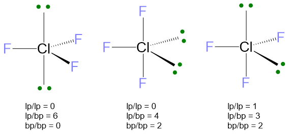 Nella prima struttura i lone pairs sono in assiale, distanti 180°, nella seconda sono in equatoriale a 120° e nell’ultima sono uno in assiale e uno in equatoriale con angolo di 90° l’uno dall’altro. Valutando le repulsioni a 90°, si vede che le repulsioni lp/lp a 90° sono assenti nelle prime due strutture, mentre c’è repulsione lp/lp per l’ultima struttura, che quindi può essere già esclusa perché le repulsioni lp/lp sono quelle che più destabilizzano la geometria. Tra la prima e la seconda struttura, la più stabile è la seconda perché ha solo 4 repulsioni lp/bp, mentre la prima ne ha ben 6. Le repulsioni bp/bp anche se presenti nella seconda e non nella prima, sono di inferiore entità ; quindi le 2 repulsioni bp/bp della seconda struttura non sono così destabilizzanti come le 2 lp/bp in più possedute dalla prima struttura.