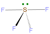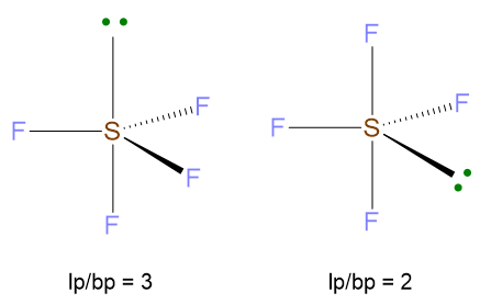 VP = 5 quindi la disposizione spaziale è bipiramide trigonale. Tuttavia siccome LP =1 con VP ≥ 5, si configura il problema di dove disporre la coppia solitaria, se nella posizione equatoriale o assiale della bipiramide trigonale. Vanno perciò valutate tutte le possibilità e va poi scelta la disposizione che minimizza le repulsioni lp/bp a 90°. Dalla figura di sotto si evince, che la posizione del lone pair in assiale dà origine a 3 repulsioni lp/bp a 90°, mentre se il lone pair è equatoriale, le repulsioni lp/bp a 90° si riducono a 2, anche se ci sarebbero anche 2 repulsioni a 120°, ma queste sono di minore entità perché l’angolo è maggiore. Dunque la disposizione più stabile è la seconda.