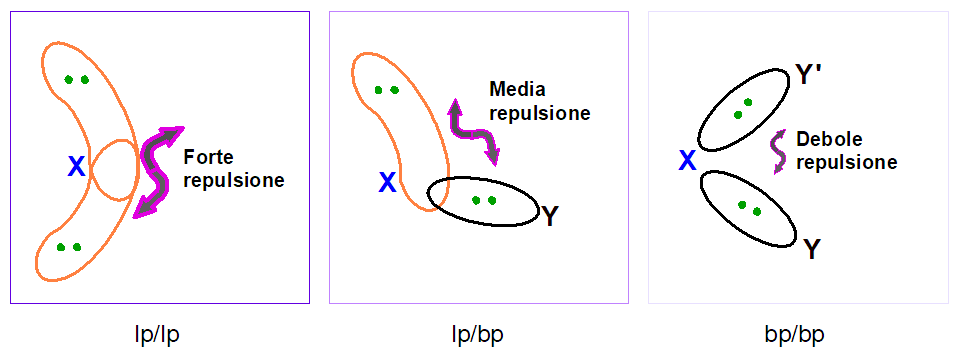 Dunque due coppie solitarie (lp/lp) si respingono con forza maggiore rispetto a una coppia solitaria e una di legame (lp/bp). La repulsione più debole è tra due coppie di legame (bp/bp).