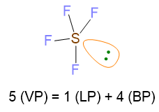 Facciamo un altro esempio per capire il punto 5 per il caso VP ≥ 5, prendendo la molecola di SF5. La sua struttura di Lewis è la seguente: