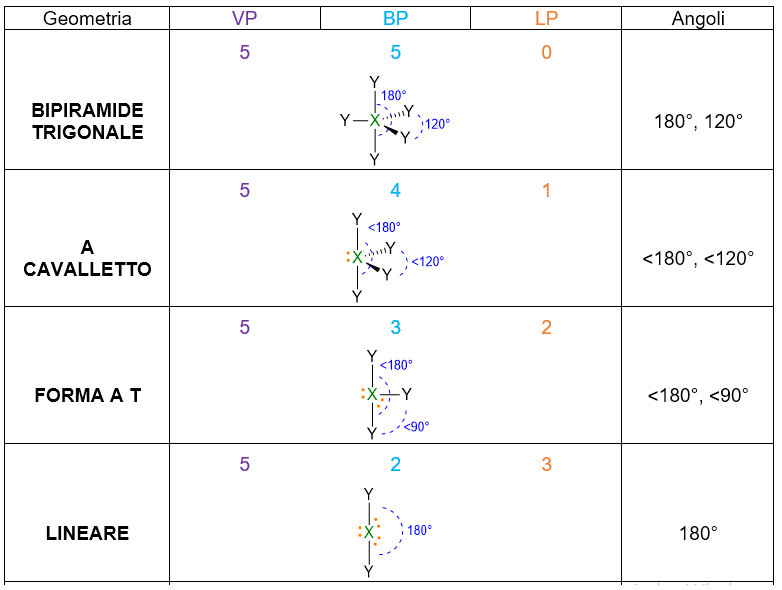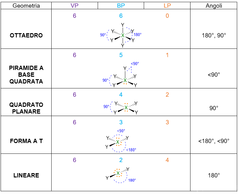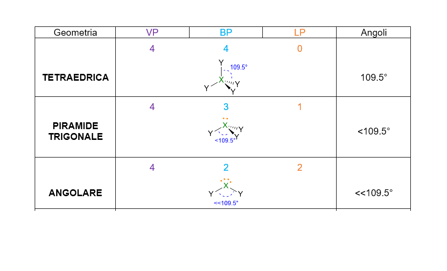 Come potresti notare dalla tabella, le molecole con almeno un LP hanno angoli inferiori rispetto agli angoli delle molecole con la stessa diposizione spaziale (stesso VP) ma senza LP.