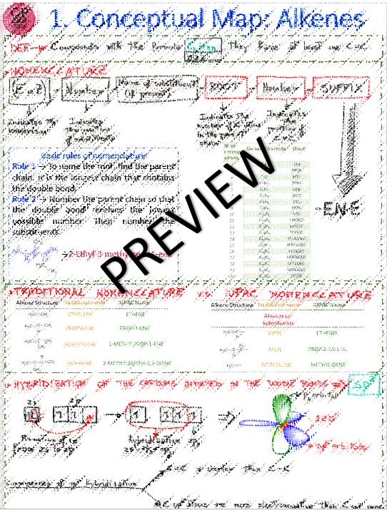 Download the PDF file of the conceptual map on alkenes. The concept map is a summary in schematic images that allows you to memorize and review topics quickly. In particular, the concept map on alkenes schematically summarizes the following information: