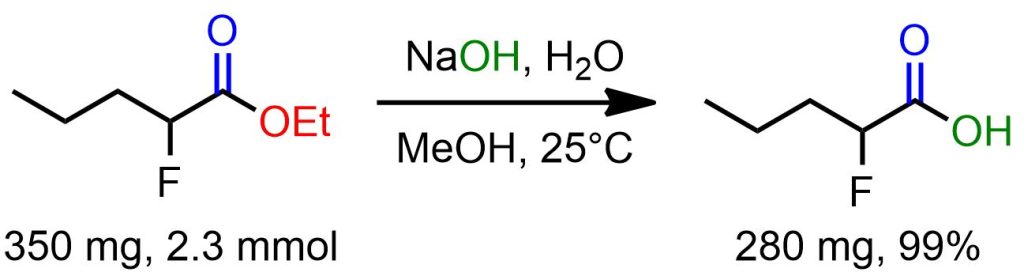 The ethyl 2-fluoropentanoate (350 mg, 2.3 mmol) was dissolved in a mixture of methanol (5 ml) and aqueous solution of 1 M NaOH (5 ml). The resulting mixture was stirred for 5 hours at room temperature. Subsequently, HCl (1 M) was added until the completion of the acidic reaction. The mixture was then extracted with ethyl acetate (3 x 50 ml). The combined organic phases were washed with water and brine, dried over Na2SO4, filtered, and evaporated under reduced pressure to yield 250 mg of 2-fluoropentanoic acid (99% yield) as a colorless volatile oil. [1]
