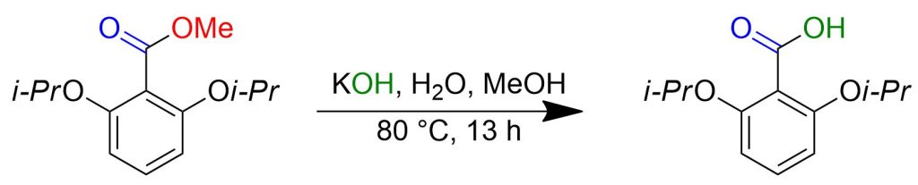 Potassium hydroxide (20 g, 0.36 mol) was dissolved in a mixture of methanol (90 mL) and water (10 mL) in a 9:1 ratio. To a 20% weight solution of KOH, methyl 2,6-diisopropoxybenzoate (8.3 g, 0.033 mol) was added, and the mixture was heated to 80°C (oil bath temperature). After stirring for 13 hours at 80°C, the mixture was cooled to room temperature, poured into 1 N aqueous HCl, and extracted twice with ether. The organic phases were concentrated under reduced pressure, and the crude solid was washed with hexane and dried to obtain 2,6-diisopropoxybenzoic acid (7.7 g, 0.032 mol) as a white solid with a yield of 98%.[3]