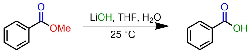 A mixture of methyl benzoate (544 mg, 4 mmol), LiOH (960 mg, 40 mmol), and water (4 ml) in THF (20 ml) was stirred at room temperature until the completion of the reaction (monitored via TLC). The reaction mixture was then acidified with 1 N HCl followed by extraction with DCM (2 × 60 ml). The combined organic phases were dried over anhydrous MgSO4 and concentrated under vacuum to obtain pure benzoic acid (88%).[5]