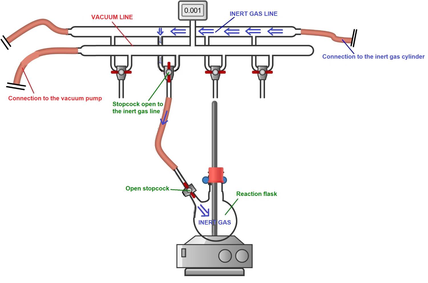 All of this can be done by connecting the glassware (reaction flasks, etc.) to the Schlenk line using tubing attached to the outlets of the Schlenk line’s stopcocks.
