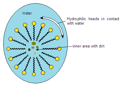 At a certain concentration, SDS molecules aggregate to form spheres that trap dirt inside them (see figure below). These spheres are called micelles and are the fundamental principle behind all detergents. Micelles, by encapsulating the dirt inside, remove it from the washed surface with the help of water. In other words, SDS works by making dirt soluble in water, thereby allowing it to be easily removed.